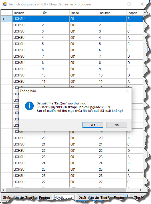 | v1.0.9 | - Thêm chức năng ghép đáp án (tổ hợp KHTN hoặc KHXH) hỗ trợ phần mềm chấm trắc nghiệm TestPro Engine. |