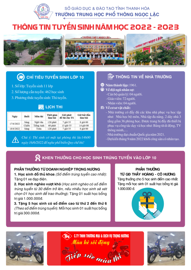 Trường THPT Ngọc Lặc thông báo về việc: Khen thưởng cho học sinh đỗ thủ khoa và học sinh đạt kết quả cao trong kỳ thi tuyển sinh vào lớp 10 THPT Ngọc Lặc năm học 2022-2023. Trân trọng cảm ơn 2 nhà tài trợ chính: Cty TNHH Thương Mại & Dịch Vụ Trọng Nương và gia đình thầy Hoàng, cô Hương giáo viên trường THPT Ngọc Lặc.