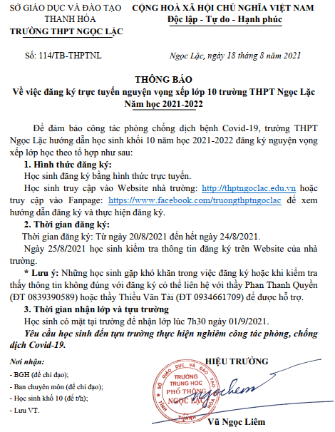 1. Thông báo về việc đăng ký nguyện vọng xếp lớp 10 theo khối trường THPT Ngọc Lặc năm học 2021-2022